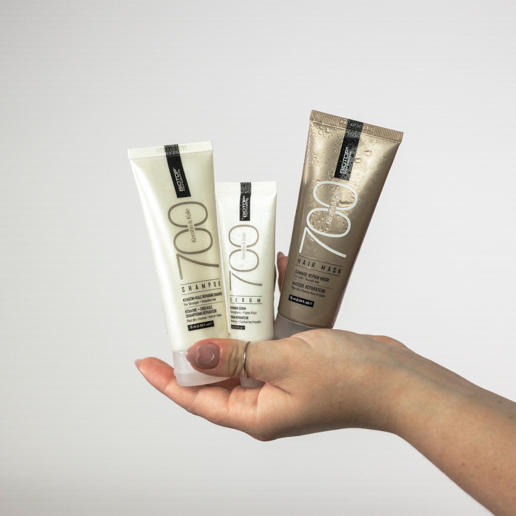 SERUM: Cyclopentasiloxane, Dimethicone, Dimethiconol, Cyclohexasiloxane, Isopropyl Myristate, Alcohol Denat (Alcohol SD-40), Parfum (fragrance(supplement), Hexyl cinnamal, Limonene, Linalool, Aqua (Water), Geraniol, Benzyl salicylate, Butylene Glycol, Hydrolyzed Keratin, Citral, Tocopheryl acetate, Retinyl Palmitate, 1,2-Hexanediol, Brassica Oleracea Acephala (Kale) Leaf Extract, Sodium Benzoate, Dipotassium EDTA