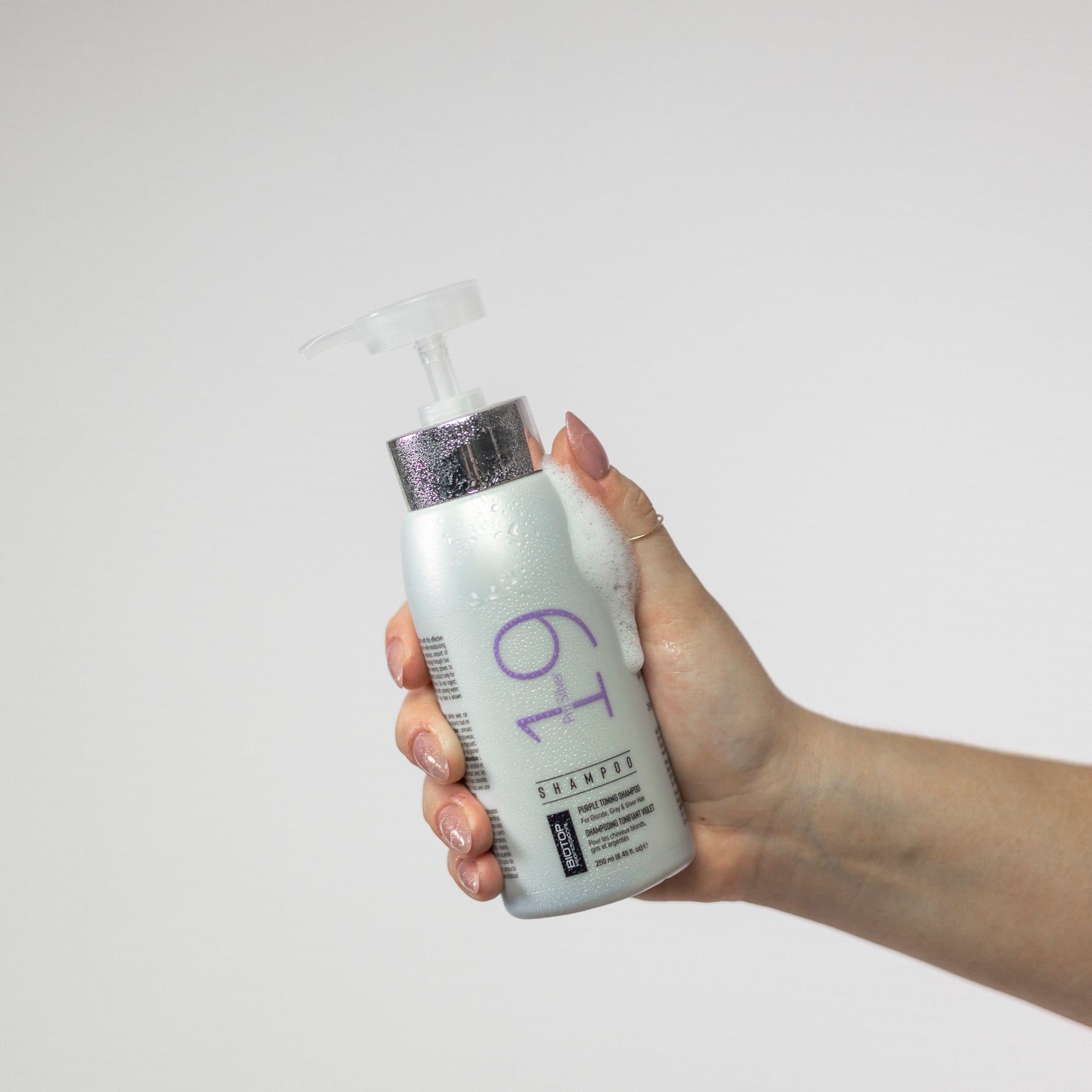 • Dispense a 2-3 pumps of 19 Pro Silver Shampoo into hands